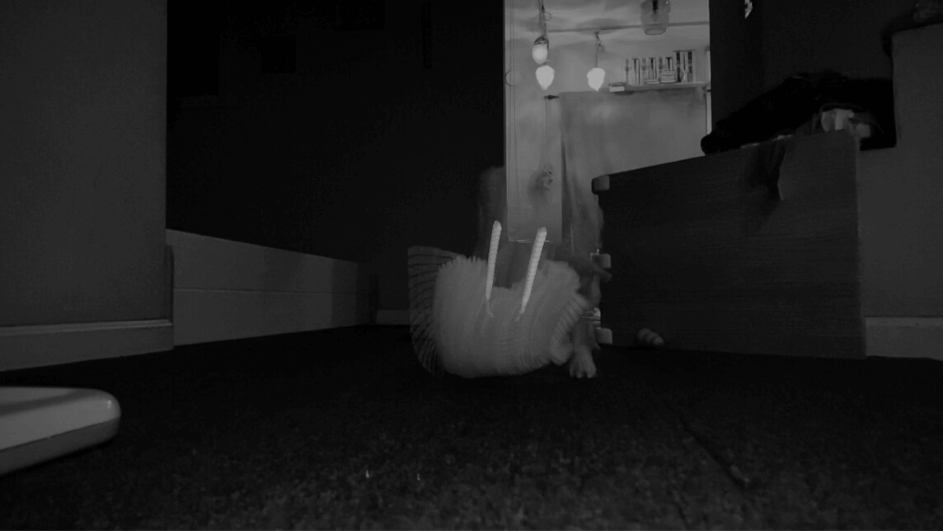 愛犬“まみみ”が獲物を捕らえるシーンをスローモーションで撮影し、TouchDesignerで映像を加工した。