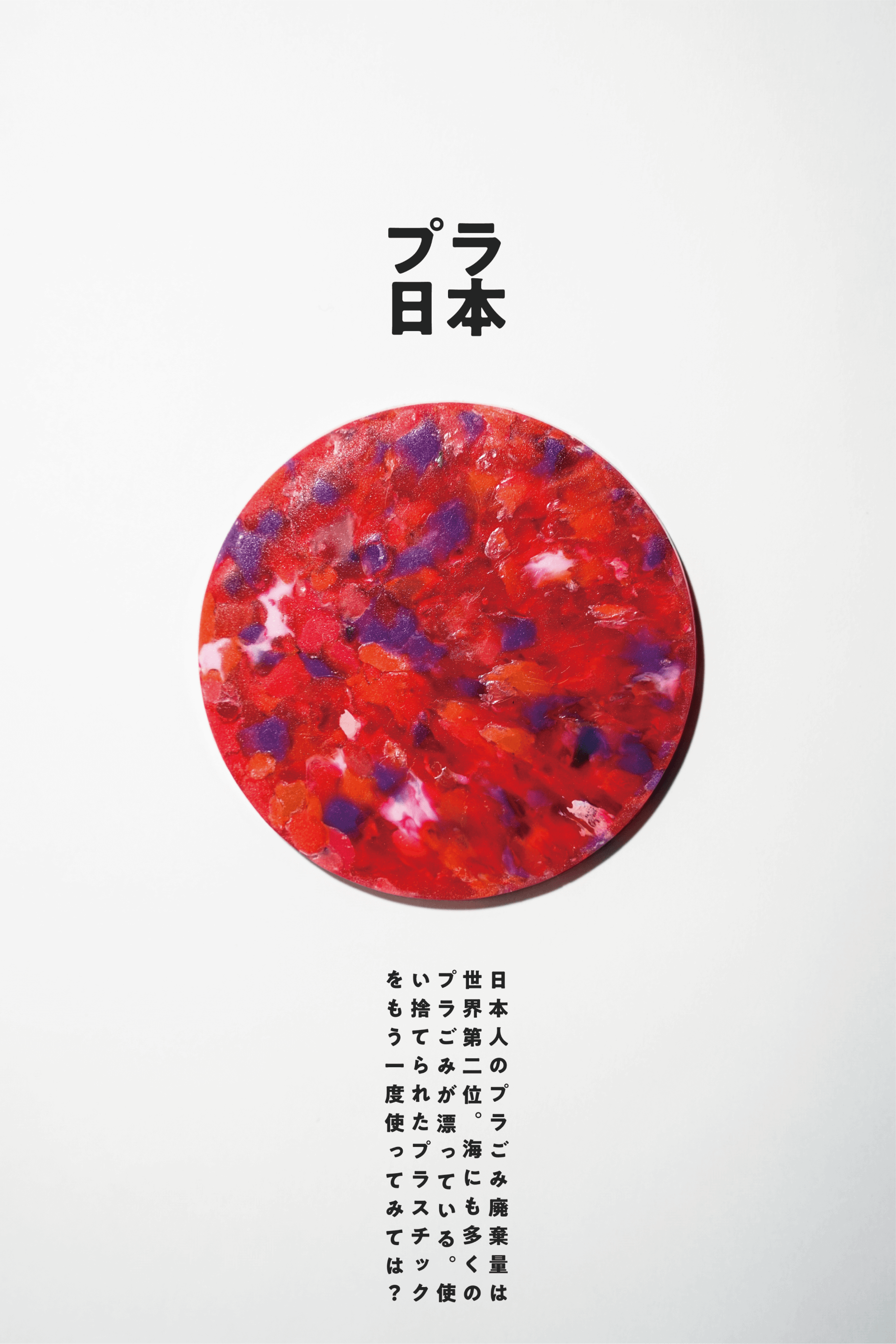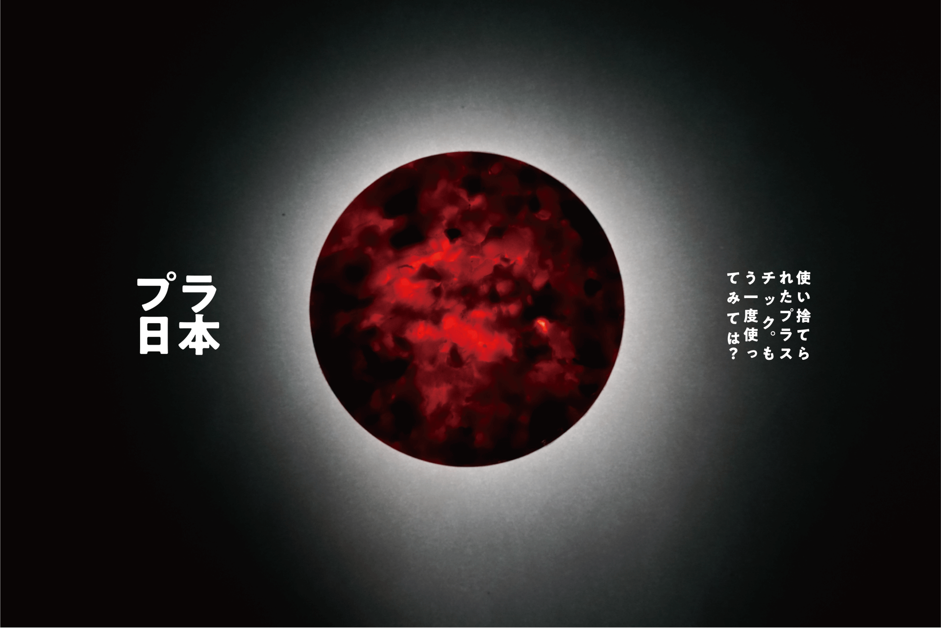 日本国内の海洋プラスチックで制作されたコースターをモチーフに日本のプラスチックゴミ問題を啓発するポスターを制作しました。日の丸を連想できるようにポスターの中央に赤いコースターを配置しました。ポスターは白と黒のに色を用意し、黒のポスターは下からライトを当てることで危機感を演出しました。