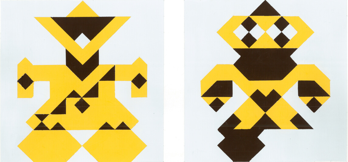 縦横10マスのグリッド上のキャンバスに遮光器土偶(右)と仮面の女神(左)をピクトグラム化した。色・高さ・幅を揃えてピクトグラムとしての共通性を重要視しました。